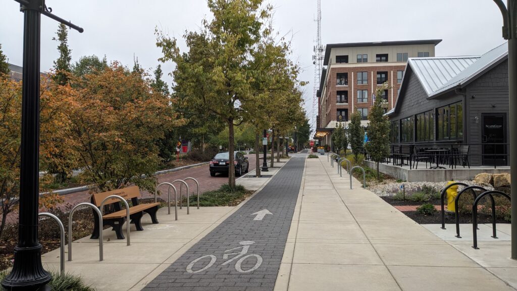Championed by Mayor Jim Brainard—and with the City of Carmel, Carmel Redevelopment Commission and Carmel Midtown Building Corporation—there was a $32 million investment in redeveloping the district, creating Monon Boulevard, a 140-foot multimodal complete street, in 2019. Throughout construction, the Monon Trail remained open as the new boulevard took shape around it. Landscaping, interactive art, and multicolored clay, granite and asphalt pavers helped designate pedestrian, bicycle and vehicular space.