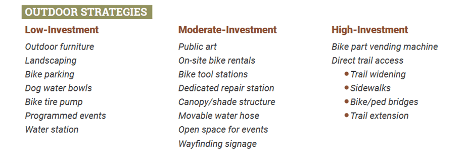 Trail-oriented development can be an effective strategy for boosting retail sales. A Portland, Oregon study showed that customers who biked to a local shop made more frequent trips and spent more overall, despite spending less than drivers per trip.In addition, trails and active transportation amenities can be a draw for new corporate businesses looking to relocate and attract young, skilled workers.
